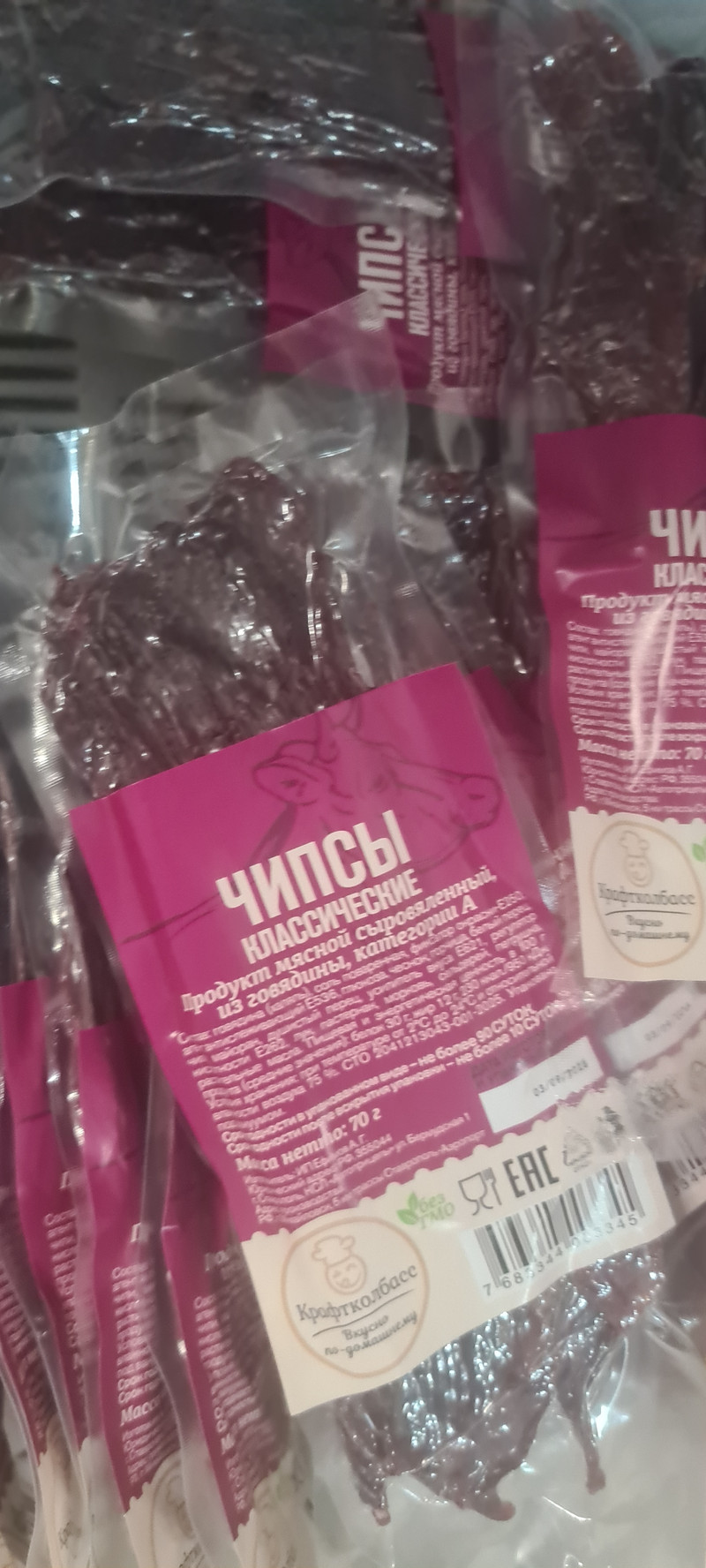 Чипсы из отборного мяса говядины, цельномышечные, сыровяленые, премиум качества.