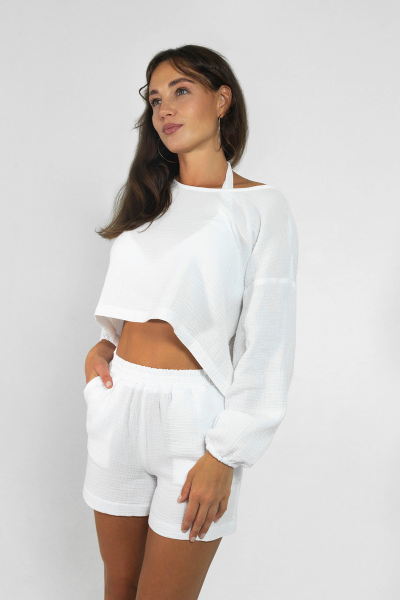 Страна производитель: Россия, Размер шорт: S, Размер лифа: S (A/B), Размер кофты: oversize M, Состав: 100% хлопок, Ткань: муслин, Цвет: белый