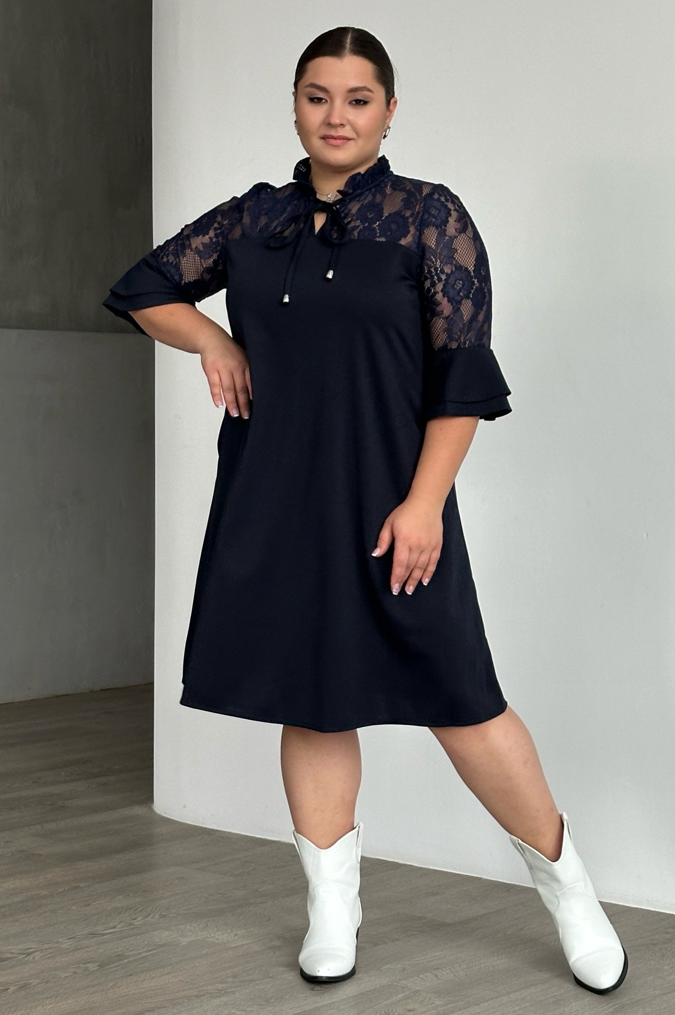 Изумительное платье трапецевидного кроя.Нежные гипюровые вставки на плечевой зоне и рукавах добавляют женственности.V-образный вырез горловины с завязкой на груди украшен рюшками.Рукава 3⁄4 с изящными воланами.Свободный крой модели не сковывает движений,мягкий и приятный телу материал визуально стройнит.