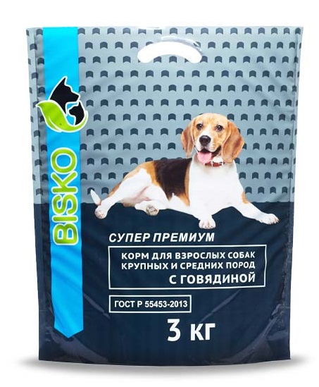 БИСКО СУПЕР ПРЕМИУМ предназначен для сбалансированного рациона взрослых собак с повышенной природной активностью и ведущих спортивный образ жизни. Структура корма — сухие гранулы на основе качественного фарша из свежей говядины и кубанских злаков (риса)
