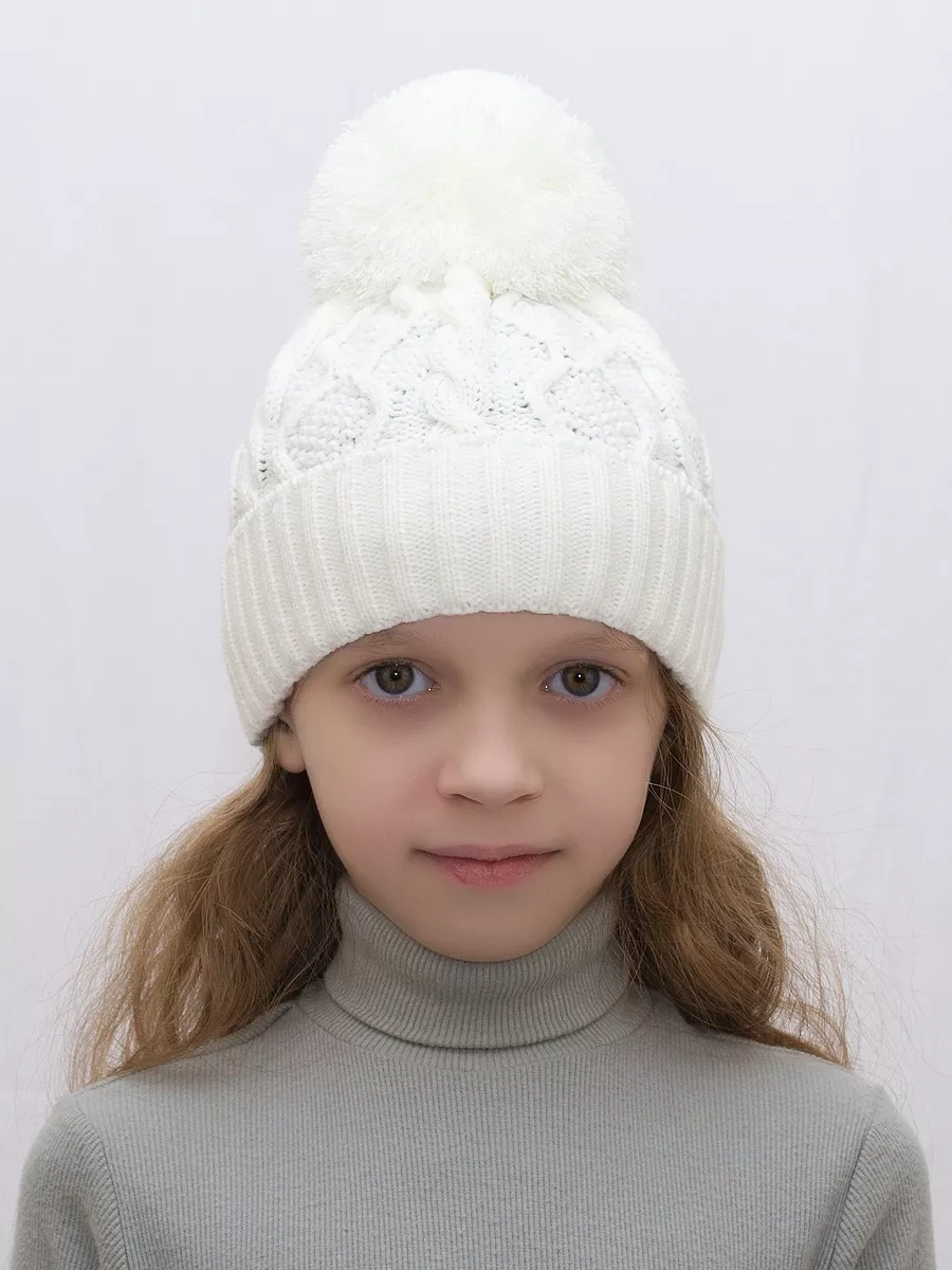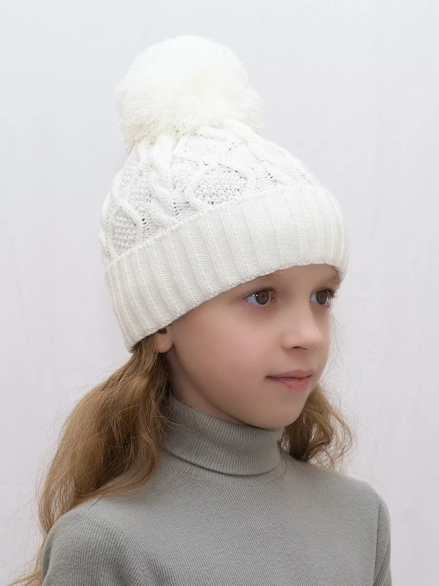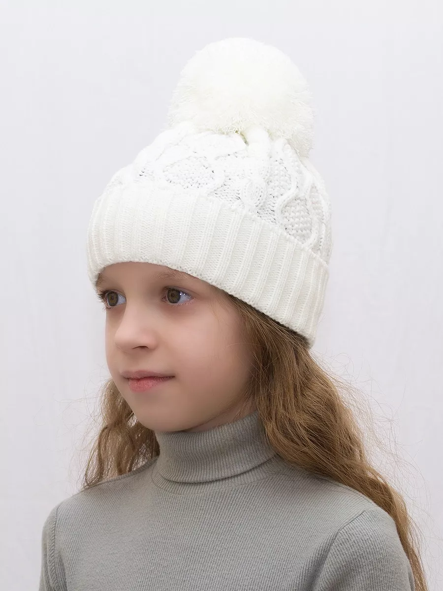 Шапка для девочки с широким отворотом из акрила. Выполнена крупной вязкой “косы” . Украшает шапку большой помпон. Благодаря хорошей эластичности, модель максимально комфортна для любого размера головы. К шапочке можно подобрать снуд из нашей коллекции,…