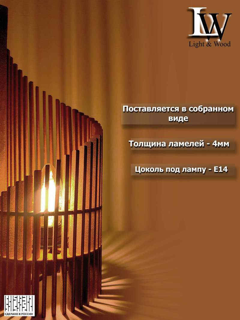 Настольный светильник “Flame” цвет дуб изготовлен из березовой фанеры высшего сорта толщиной 4 мм. При изготовлении используется покрытие высокого качества, что обеспечивает долгий срок службы. Также оно не имеет запаха, и обладает гипоаллергенными свойствами, делая использование более комфортным. Деревянный светильник имеет следующие габаритные размеры: длина 12 см , высота 30.5 см. Лампа поставляется в собранном виде, а значит вам не понадобится изучать сложные схемы и тратить время на сборку. Вся фурнитура исполнена в стильном черном цвете. Площадь освещения до 20 кв. м. В комплекте уже есть филаментная лампа, однако, вы без труда сможете заменить ее самостоятельно в соответствии с вашими предпочтениями. Так с яркой лампочкой, можно использовать светильник для чтения, а с менее яркой в качестве ночника. Разместите лампу на прикроватной тумбе или же журнальном столике, в любом помещении она создаст уют и станет стильным акцентов в вашем интерьере. Хорошо сочетается с экологичным, ретро, лофт или скандинавским стилем.