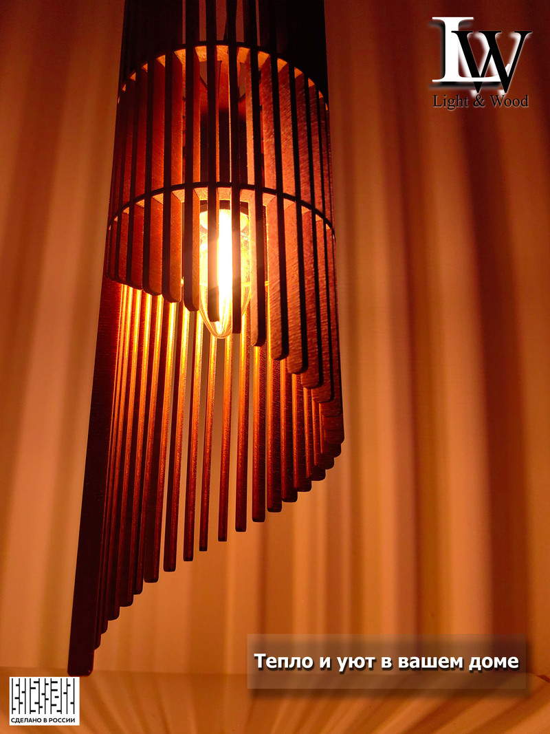 Соберите в одном сочетании стильный интерьер. Светильник - люстра подчеркнет стиль и уют в вашем доме. Уникальный дизайн привнесет современный взгляд на освещение. Плафон, выполненный из березовой фанеры высшего сорта. Деревянная конструкция обеспечивает надежность и долговечность.