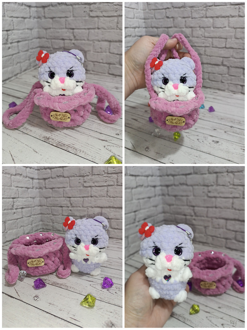 Мягкая игрушка нежно-сиреневая кошечка в темно-розовой ажурной корзиночке ручной работы.