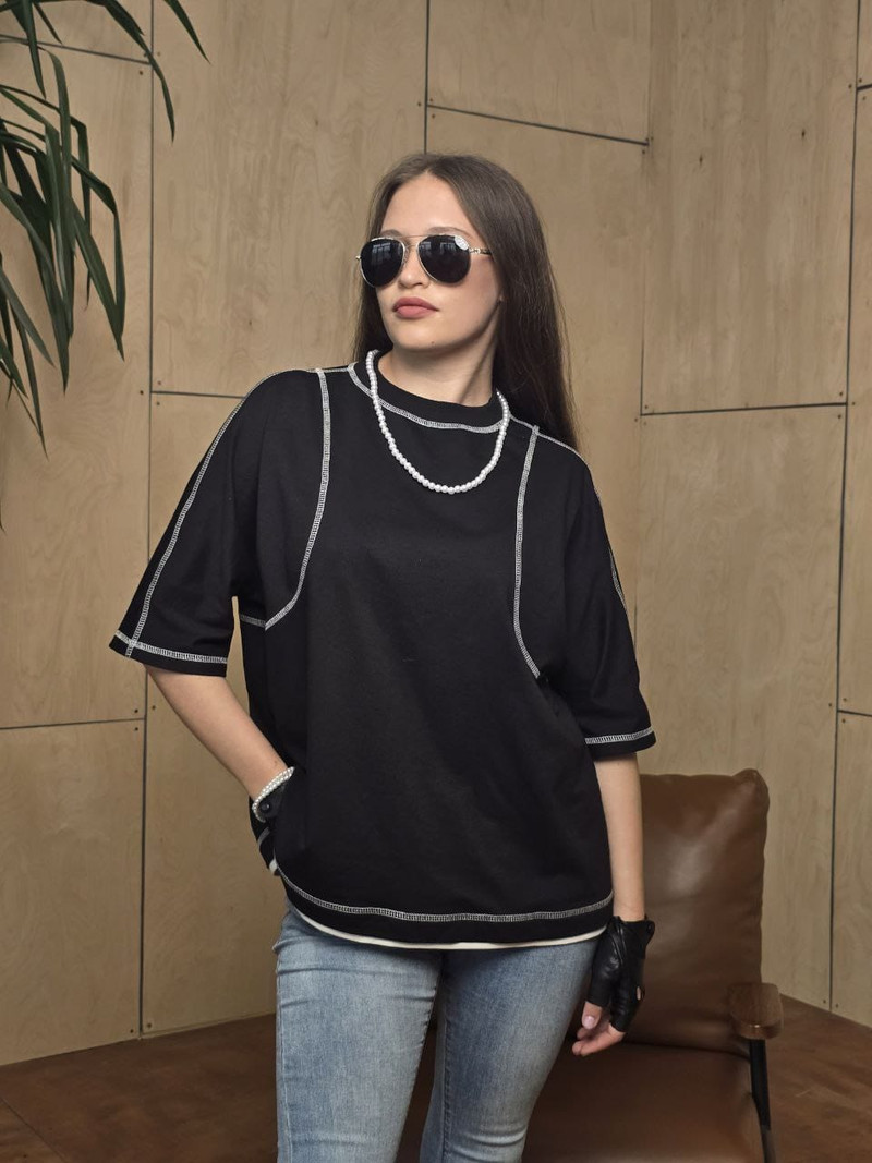Особенностью данной футболки является декоративная контрастная отстрочка по линиям конструкции изделия. Контрастные швы создают эффектный визуальный акцент и добавляют изделию изюминку.