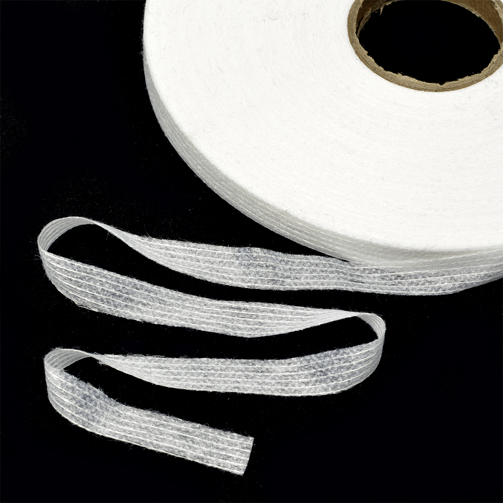 Лента клеевая нитепрошивная по долевой - прокладочный материал с клеевым слоем по одной стороне, скроена по долевой - благодаря чему лента не тянется. Сцепление с основным материалом происходит за счет клея при температуре 130-150? в течение 12-15 сек, давление 1,5-2,5 кг/см. Лента ипользуется для укрепления проймы, горловины, предохраняет швы от растяжения.