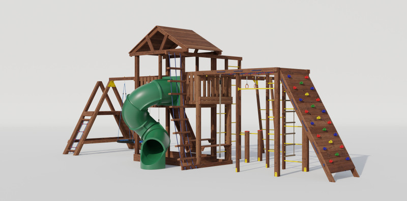 Каркас игровой площадки изготовлен из клееного бруса сечением 90*90 мм, и массива сосны 40*90, пол,
