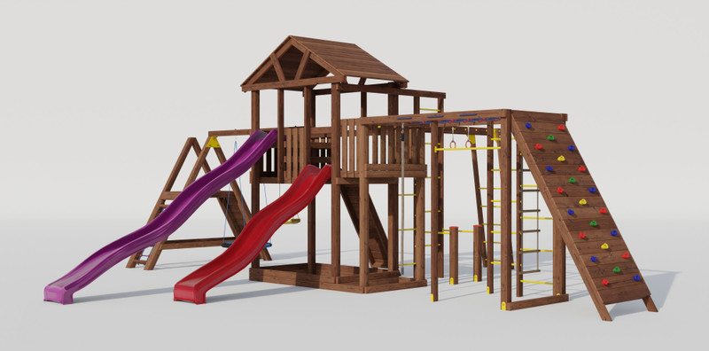 Каркас игровой площадки изготовлен из клееного бруса сечением 90*90 мм, и массива сосны 40*90, пол,