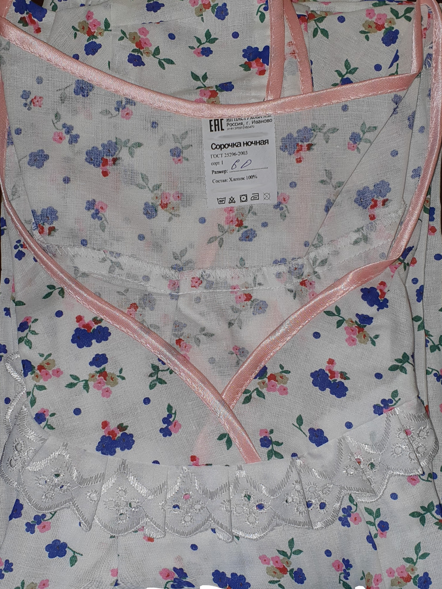 Ночная сорочка женская “Крыло”Из 100% натурального материала - ХЛОПКА Расцветки представлены для примера и могут меняться. Возможно повторение расцветок в заказе. К преимуществам ситца относится его: экологичность – ткань безопасна как для детей, так и для окружающей среды; неприхотливость и простота в уходе – его легко стирать, сушить и гладить, а хранение не требует особенных условий; комфортность – тело в ситцевой одежде дышит, ткань впитывает излишнюю влагу; яркость — огромная палитра цветов и оттенков характерна как раз для него. Текстиль и одежда из ситца неприхотливы в уходе. Свойства ткани ситец позволяют стирать ее как вручную, так и в машинке-автомат. Первая процедура должна произойти сразу после покупки. Даже прополоскав в холодной воде новую одежду, можно получить приятный эффект – ткань станет мягче, а рисунок и цвет сохранится дольше.Общие требования к стирке:Вода не должна быть горячее 50°C; Отсутствие отбеливателя (хлор и подобные ему вещества негативно влияют не только на рисунок, но и саму структуру полотна). Сушить белье на открытом пространстве, предварительно встряхнув и расправив.Гладить в режиме «хлопок». Ткань гладится без отпаривания.ХарактеристикиМатериал: Ситец ГОСТПлотность ткани: 100 г/м2Состав: 100% хлопокПроизводство: г. Иваново.