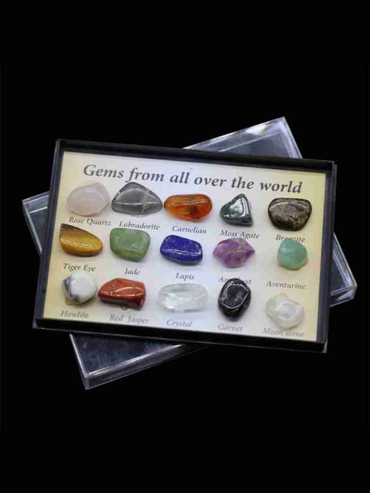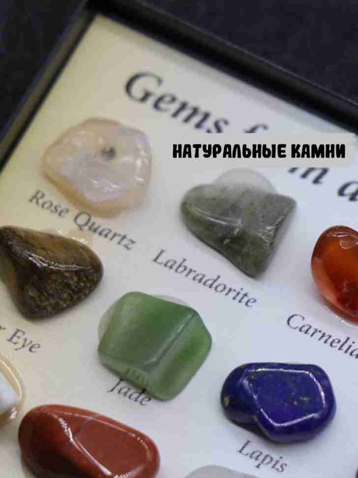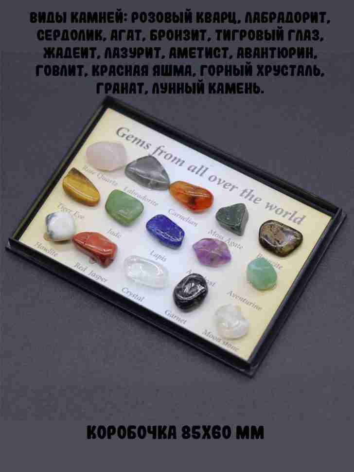 Виды камней: Розовый кварц, лабрадорит, сердолик, агат, бронзит, тигровый глаз, жадеит, лазурит, аметист, авантюрин, говлит, красная яшма, горный хрусталь, гранат, лунный камень.