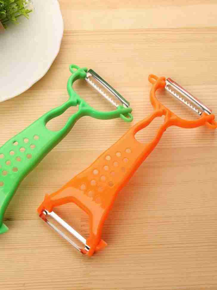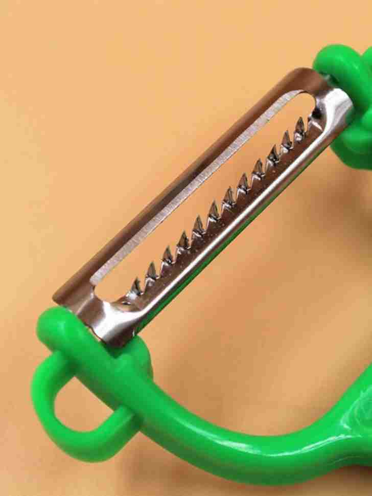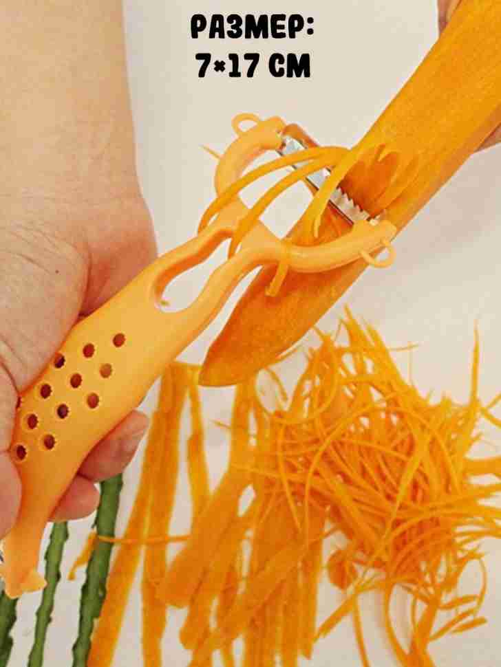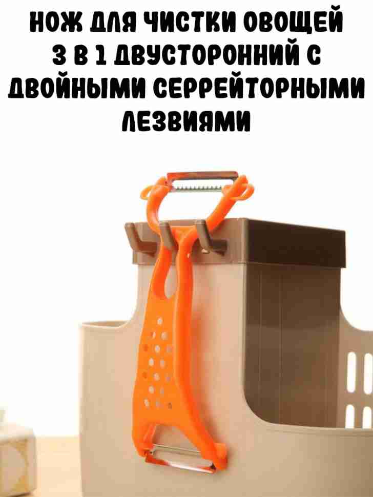 Кухонный нож для чистки и фигурной нарезки овощей 3 в 1 двусторонний с двойными серрейторными лезвиями. Позволяет чистить и нарезать овощи фигурной соломкой.