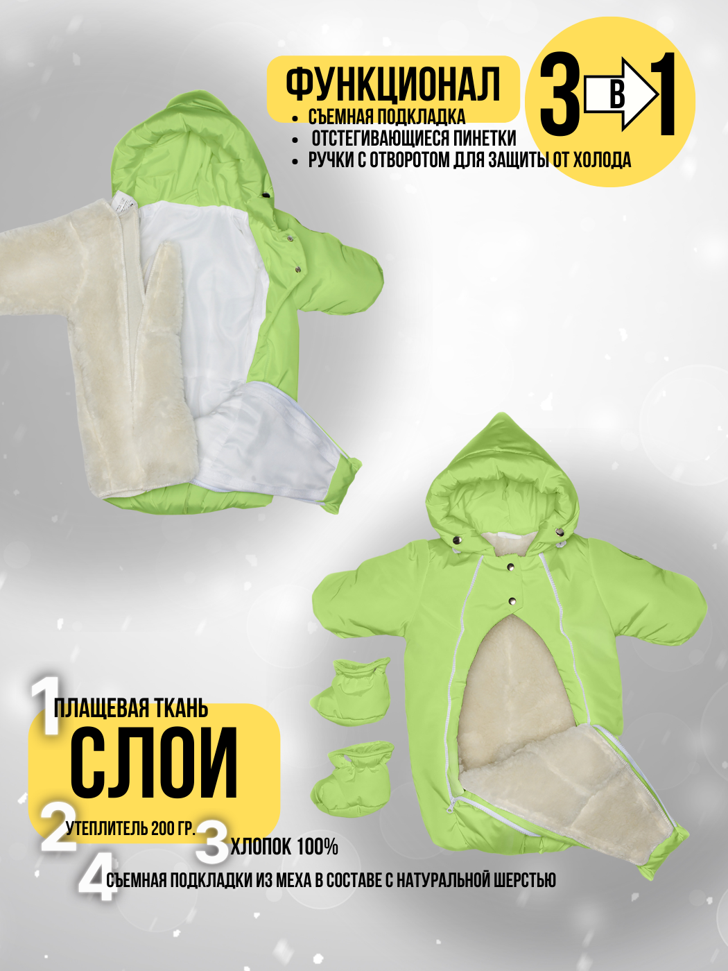 Состав: верх-100%пэ. утеплитель -синтепон 200гр, подстежка съёмная с содержанием шерсти 10%