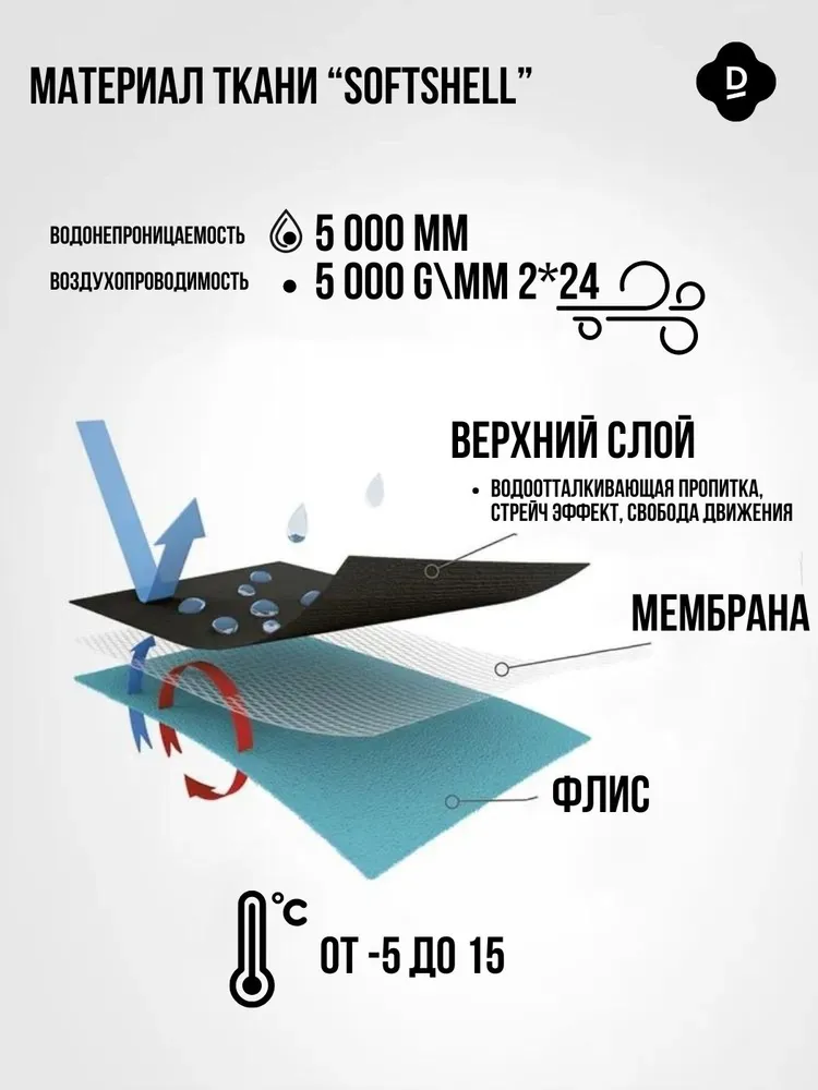 Состав: SoftShell 100% Мембрана WR 5000/5000, 3 слоя: верх плащевка-мембрана-флис