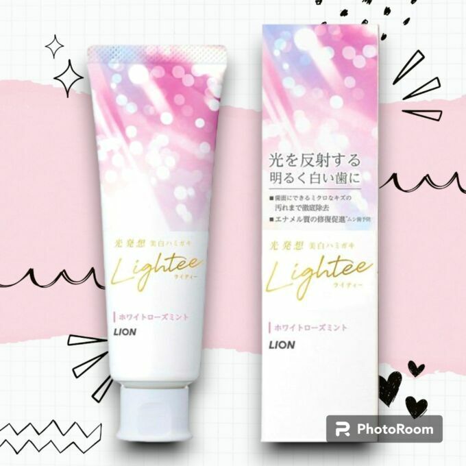 Для сияющей улыбки и здоровья зубов! Технология Lightee основана на накопленных достижениях и опыте компании Lion в области восстановления здоровья и первоначальной белизны зубов. На поверхности зубов возникают микротрещины, в которых скапливаются загрязнения, вызывающие тусклость эмали. Активные компоненты пирофосфат натрия и оксид алюминия (микропудра) проникают вглубь микротрещин и удаляют загрязнения, налёт от чая, кофе, вина, табака и пр. Фторид натрия заполняет трещины, восстанавливает эмаль, предотвращает развитие кариеса и делает поверхность зуба идеально гладкой. После заполнения трещин эмаль становится сияющей и яркой. Антибактериальный компонент лаурил саркозинат натрия (LSS) уничтожает бактерии, являющиеся причиной возникновения неприятного запаха. Паста обеспечивает свежесть дыхания на весь день. Можно использовать с электрической зубной щёткой. Мятный вкус пасты украшен нотами нежной розы, свежестью граната и будоражащими специями.