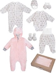 Великолепный детский набор состоит из 7 предметов, включает самые необходимые вещи для новорожденного — ползунки, боди для новорождённого, комбинезон нательный, комбинезон для прогулок, детскую шапочку, пинетки и антицарапки. Вся одежда изготовлена из нежного 100% хлопка, приятного для чувствительной кожи младенца. Комбинезон для прогулок выполнен из велюра сна трикотажной подкладке (100% хлопок). Боди имеют застежки-кнопки, которые позволяют быстро переодеть малыша и заменить подгузник. Широкий пояс ползунков не будет сковывать движений малыша. Рукавички-антицарапки защищают детское личико. Хлопковый чепчик удобен, практичен и легко может носиться как отдельно, так и в сочетании с другим головным убором. Все предметы одежды выполнены в теплых тонах. Набор упакован в подарочную коробку. При соблюдении условий ухода изделия сохраняют форму и цвет.