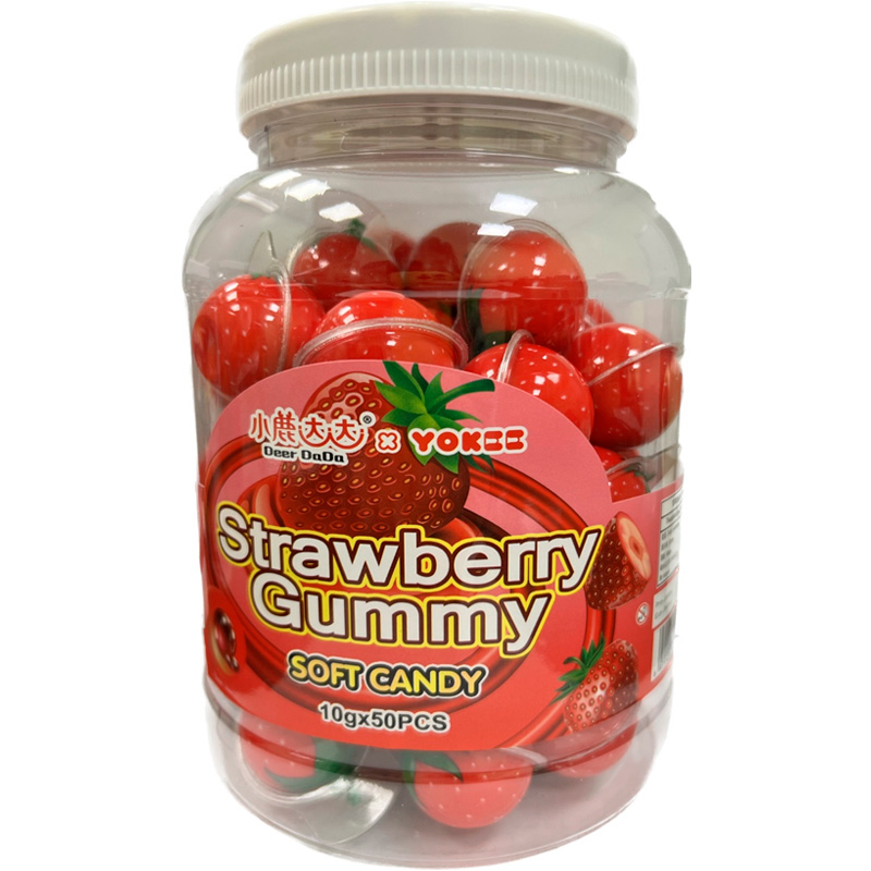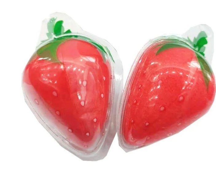 Жевательные конфеты в форме клубники, заполненные джемом из сочной клубники.Состав: вода, сахар, сок яблочный концентрированный, патока мальтозная, желатин, крахмал, агар, лимонная кислота, ароматизаторы.