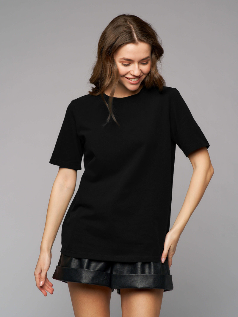 Футболка прямого силуэта с приспущенным плечом и круглым вырезом, сшита из плотного хлопкового трикотажа. Лаконичная модель будет уместна в не формальном офисе в комбинации с пиджаком или джемпером, а также на прогулке в сочетании со свитшотом или худи.