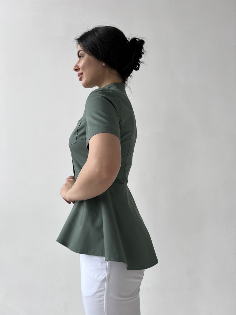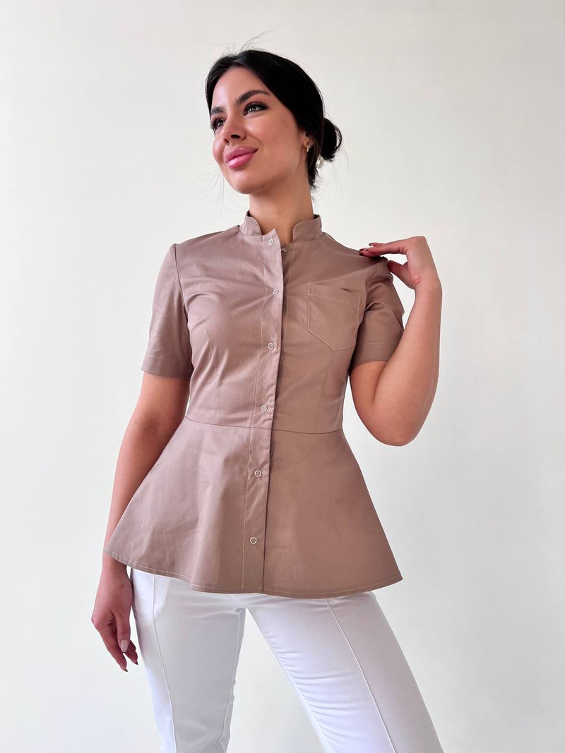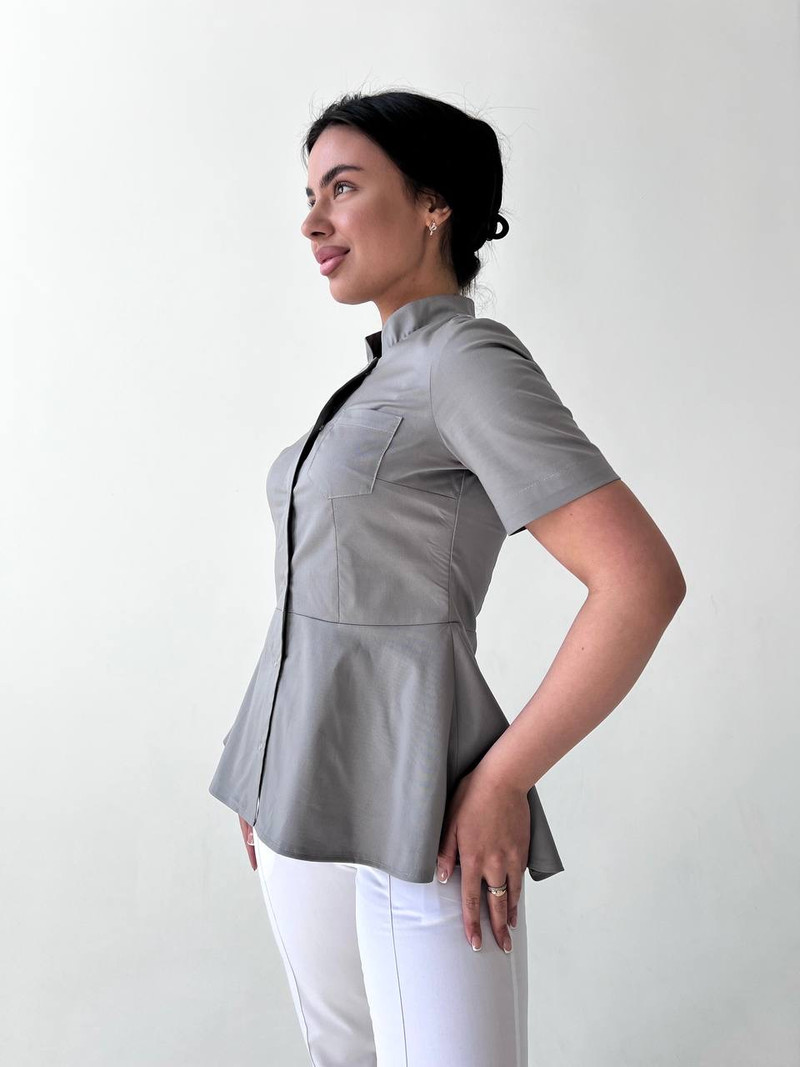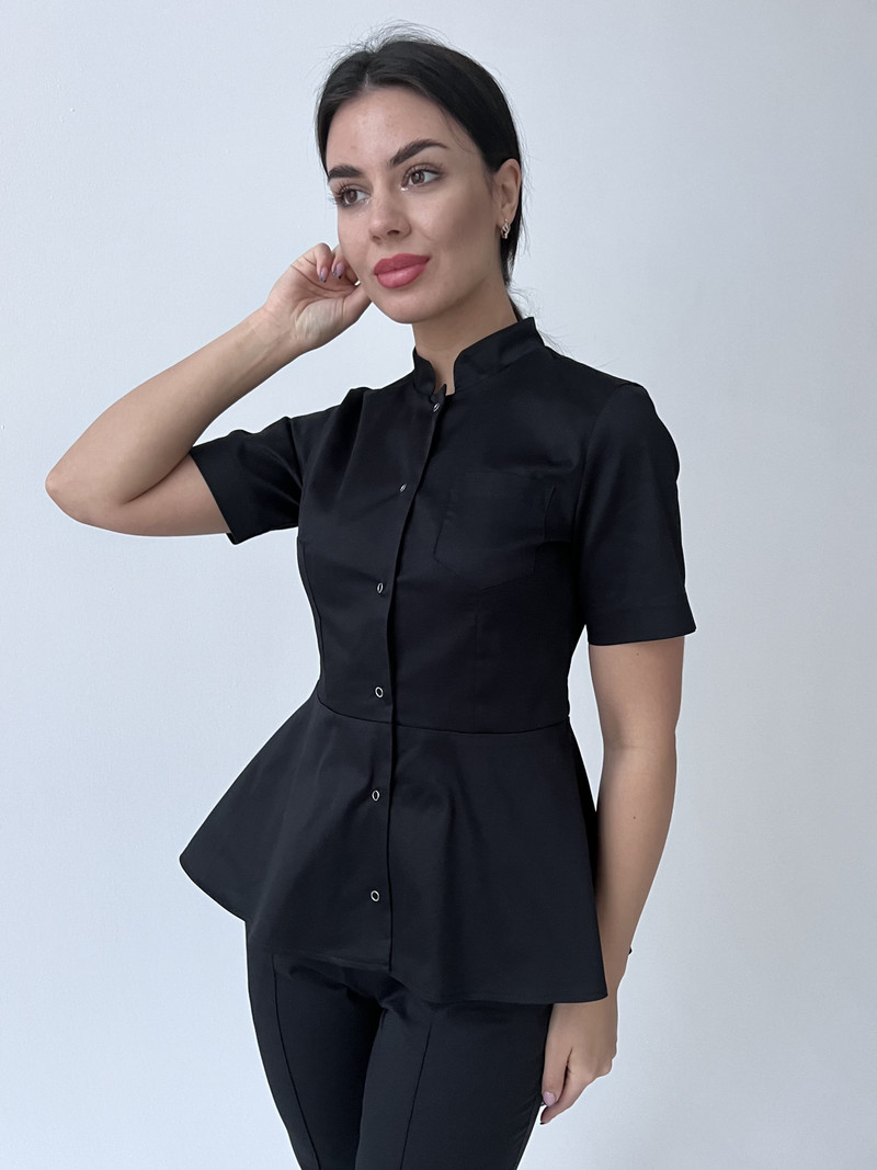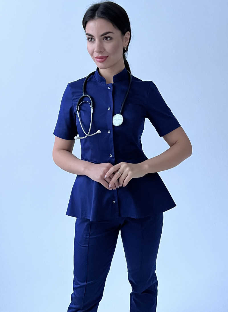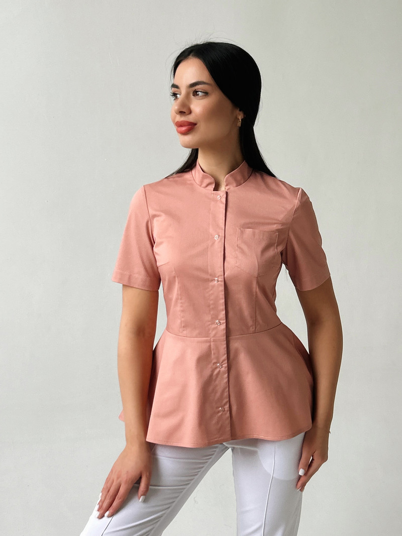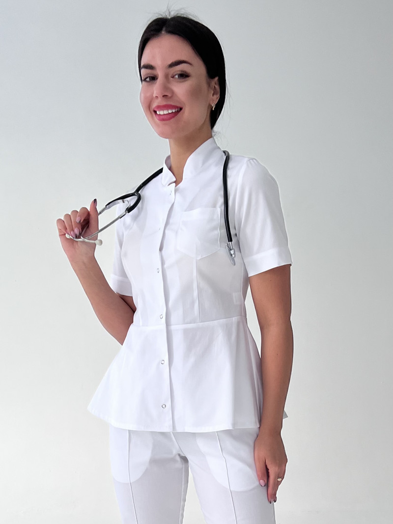 Стильная медицинская блуза прилегающего силуэта. На переде нагрудные вытачки. Также на уровне груди расположен накладной карман на левой стороне. Нижняя часть мед рубашке оформлена баской, что подчеркивает линию талии и не дает облегание по бедрам. Центральная застежка на кнопках. Воротник-стойка и втачной рукав выше локтя создают лаконичный образ. Длина изделия до уровня бедер с удлинением по спинке. Так же эта медицинская одежда для женщин подойдет для работы скорой помощи, ветеринара и массажиста. Наши мед костюмы пользуются популярностью у косметолога и мастера маникюра.