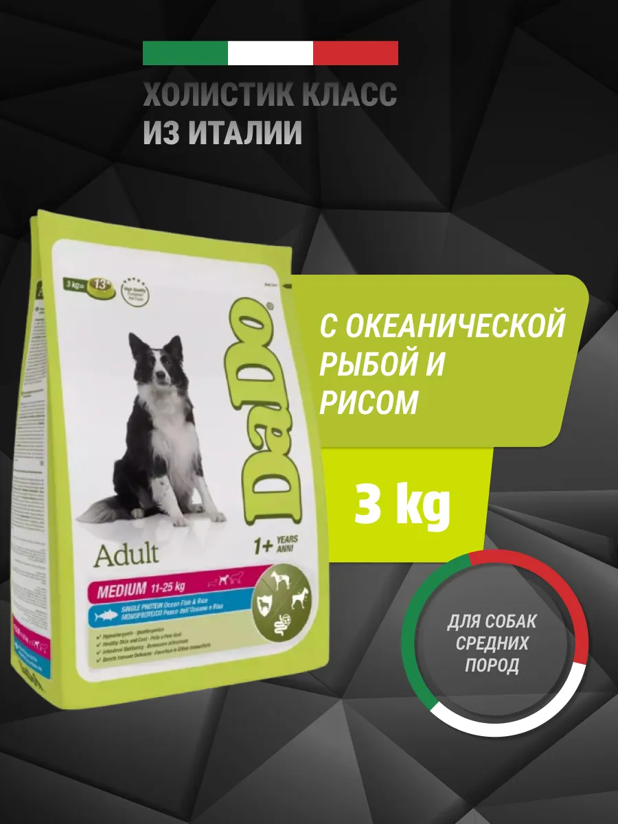 Корм класса холистик для собак средних пород DaDo представляет собой высококачественный продукт, произведенный в Италии, который обеспечит вашего питомца сбалансированным и питательным рационом. Основой корма является обезвоженная океанская рыба (минимум 30%), что делает его отличным источником белка и необходимых жирных кислот, способствующих здоровью кожи и шерсти.