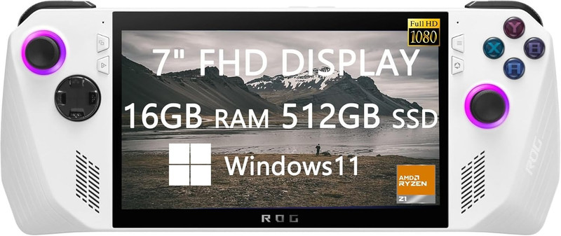 ASUS-ROG Ally — портативная игровая консоль с частотой обновления 120 Гц, 7-дюймовым сенсорным экраном Full HD 1080p и процессором AMD Ryzen Z1 Extreme.