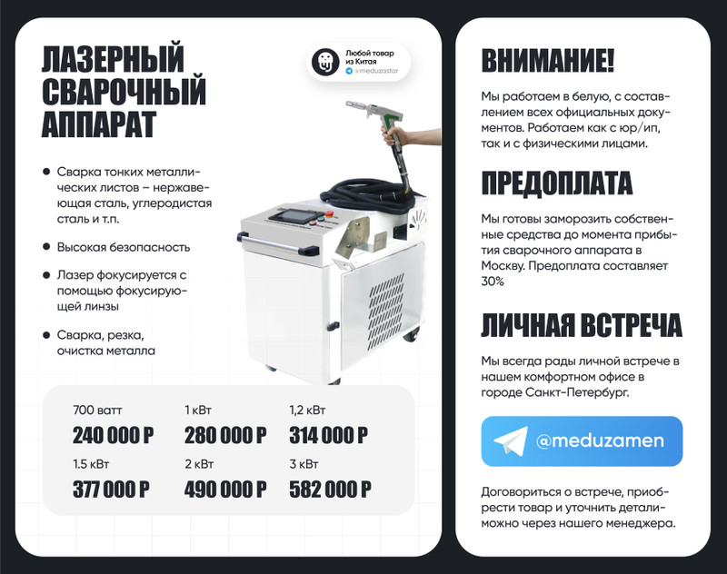 Чтобы купить Лазерный сврочный аппарат — - lsa01 оптом по цене 240000 руб., свяжитесь с поставщиком. Компания поставщик — Meuduzastore (ООО «Гаджетстор») из города Санкт-Петербург. Минимальная партия 1 шт. Доставка возможна самовывоз, транспортной компанией, автомобилем, железной дорогой, курьером. Способы оплаты: наличными, безналичная оплата, электронные деньги.