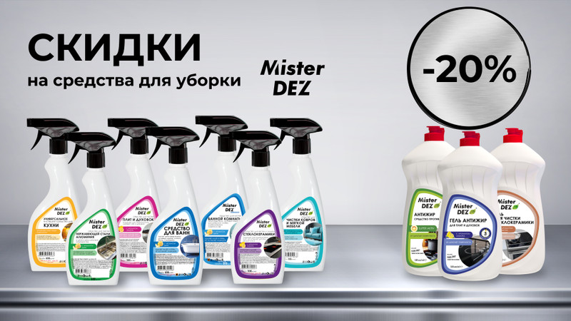 Скидка в 20% на средства для уборки Mister DEZ сделает вашу оптовую закупку у завода-изготовителя ООО «ЕвроТек» ещё выгоднее. Успейте воспользоваться специальным предложением с 1 по 14 февраля 2026 года, а мы в свою очередь обеспечим вам быструю поставку в любом объёме.