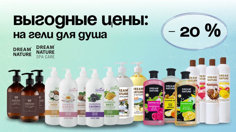 Купить гели для душа оптом напрямую от производителя можно легко с ООО «ЕвроТек». Прямо сейчас мы предлагаем скидку в 20% на гели для душа DREAM NATURE. Предложение действует с 01.02.2026 по 14.02.2026.