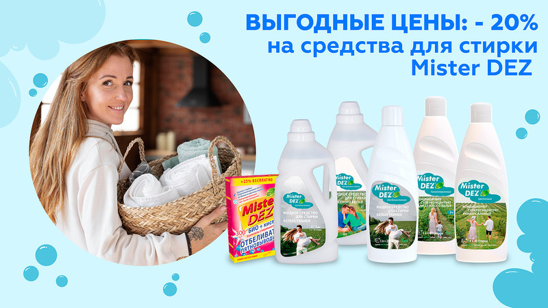 Купить средства для стирки Mister DEZ оптом напрямую от производителя ООО «ЕвроТек» можно со скидкой в 20% с 01.11.2025 по 15.11.2025. Успейте воспользоваться выгодным предложением!