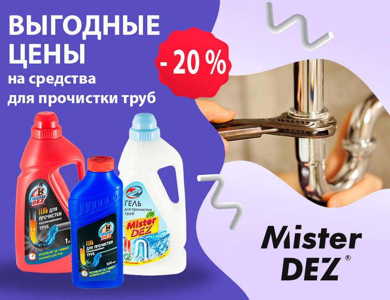 Купить средства для прочистки труб оптом можно напрямую от производителя ООО «ЕвроТек». Средства для труб Mister DEZ, проверенные временем, доступны для закупки по самым выгодным ценам со скидкой -20% с 30.09.2025 по 15.10.2025.