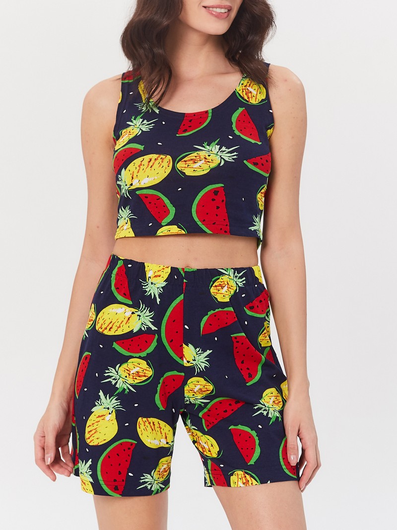 Комплект домашней одежды с шортами из 100% хлопчатобумажного трикотажа с принтом. Шорты на резинке без карманов.