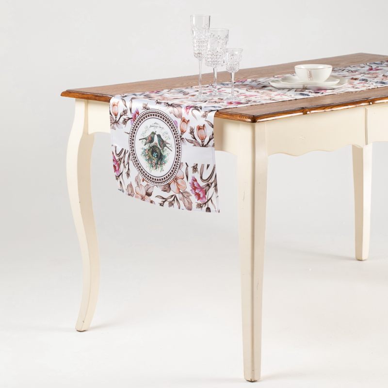 Дорожка на стол “Лилии” станет стильным дополнением интерьера Вашего дома. Выполненная из современного прочного материала, украшенная изображением прекрасных цветов и рисунком с двумя птичками у гнезда, она будет радовать Вас, создавая ощущение домашнего тепла и уюта. Нежный цветочный принт подарит весеннее настроение в любое время года. Надпись (“Мир Вашему дому”) придает особое очарование. Дорожка может использоваться как самостоятельный элемент интерьера, так и в качестве дополнения коллекции “Лилии”. Коллекция создана дизайнером “Myatashop” на основе рисунков российского художника Алёны Наливкиной. Оригинальный дизайн и эффектное цветовое решение позволяют расставить необходимые акценты. Создайте неповторимую атмосферу в Вашем доме с предметами интерьера из нашего магазина!