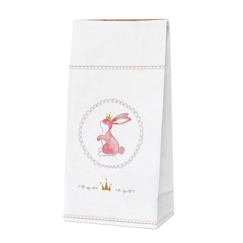 Необычный мешок для игрушек очень понравится детям. С ним уборка игрушек превратится в весёлое и интересное занятие. Пакет изготовлен из крафт-бумаги – экологически чистого и безопасного материала, и украшен милым изображением кролика в золотой короне. При необходимости пакет можно быстро сложить и убрать, что очень удобно. Такой стильный пакет будет очень интересно смотреться в интерьере детской комнаты.