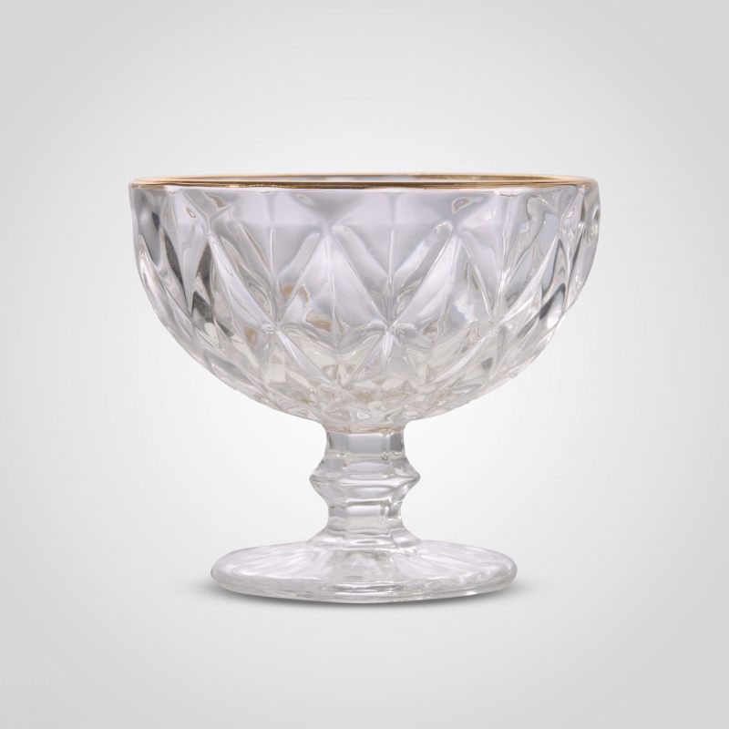 Красивая креманка с фактурными стенками “Бриллианс” на ножке станет великолепным дополнением сервировки Вашего стола. Она изготовлена из стекла, отличается практичностью и функциональностью. Стенки имеют фактурный рисунок в виде крупных ромбов. Но краю декорирована золотистой каймой. Подойдет для подачи десертов, мороженого или порционных закусок. Создайте особую атмосферу в Вашем доме вместе с нашим интернет-магазином!