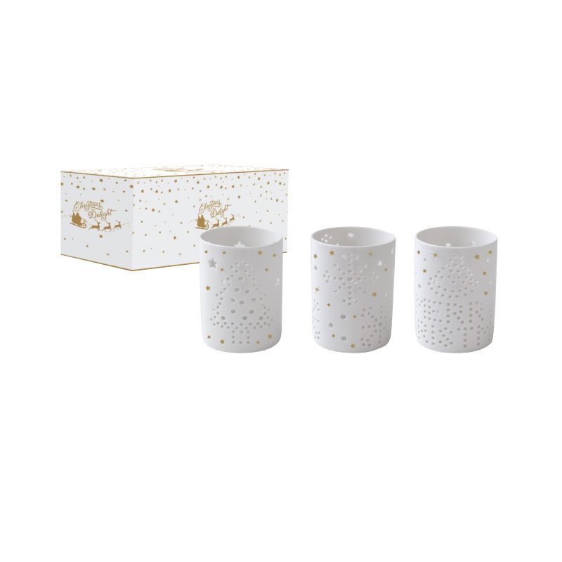 Небольшие подсвечники “Christmas delight” дополнят праздничный интерьер Вашего дома, наполнив его атмосферой настоящей сказки. Мерцающий мягкий свет подарит тепло и уют. Подсвечники изготовлены из белого фарфора, отверстия, через которые проникает свет, выполнены в форме ёлочки, снежинок и надписи с пожеланием счастливого Рождества. Имеет привлекательную упаковку и станет запоминающимся подарком для Ваших друзей и близких. Сочетается с другими предметами коллекции “Christmas delight”. Создайте неповторимую атмосферу в Вашем доме вместе с нашим магазином! Свечи не входят в комплект.