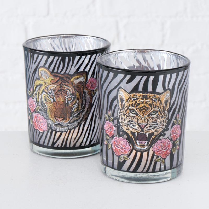 Подсвечник с символом года изготовлен из стекла и украшен изображением тигра/леопарда на фоне анималистичного принта в виде черно-белых полос. Отличный вариант подарка! Создайте особую атмосферу вместе с нашим интернет-магазином!