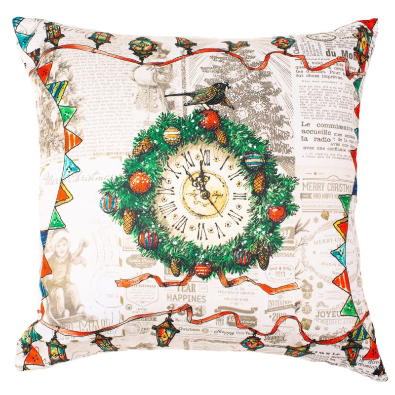 Чудесная мягкая подушка “Пряничное Рождество” украсит любой уголок Вашего дома и станет его эффектным дополнением. Подушка, выполненная из современного прочного материала (твил), украшена изображением часов с наряженным рождественским венком и гирляндами из флажков и фонариков. Основной фон представляет собой коллаж из газетных вырезок и фотографий на новогоднюю тему. Наполнитель - холлофайбер. Такая подушка станет идеальным дополнением коллекции “Пряничное Рождество”. Создайте неповторимую атмосферу в Вашем доме с предметами интерьера из нашего магазина!