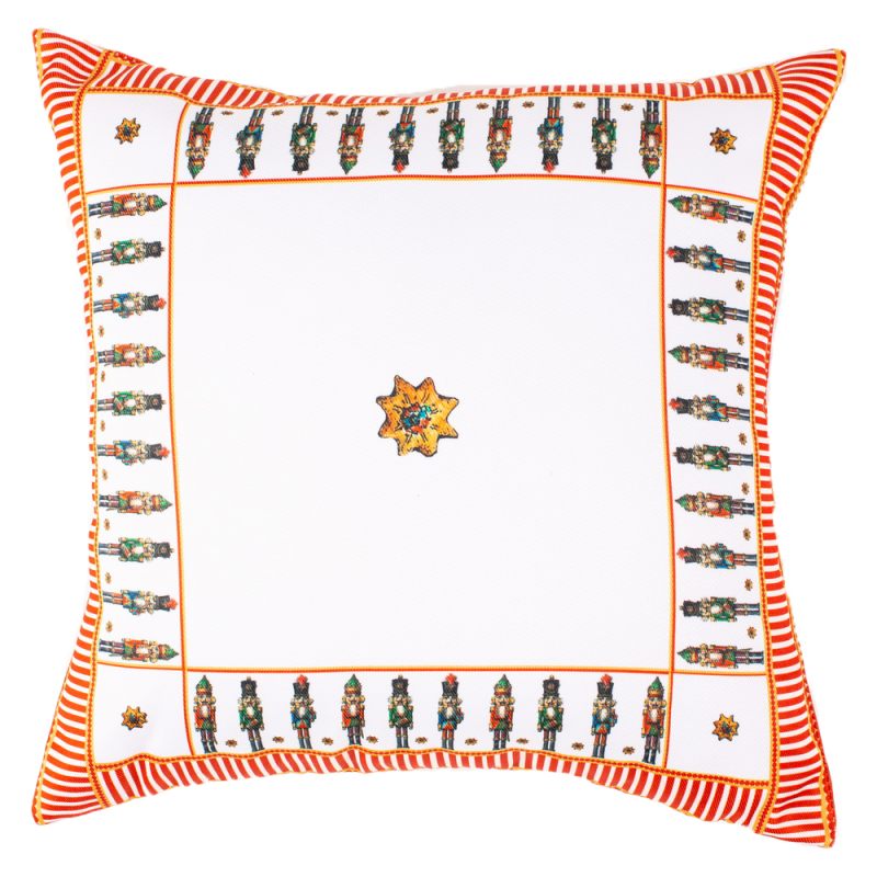 Чудесная мягкая подушка “Щелкунчики” украсит любой уголок Вашего дома и станет его эффектным дополнением. Подушка, выполненная из современного прочного материала (твил), по краям украшена яркими изображениями Щелкунчиков и окантована вертикальными полосками красного цвета. Контрастное сочетание белых и красных полосок и белоснежный основной фон привлекают внимание к необычному оформлению. Наполнитель - холлофайбер. Такая подушка станет идеальным дополнением коллекции “Щелкунчики”. Создайте неповторимую атмосферу в Вашем доме с предметами интерьера из нашего магазина!