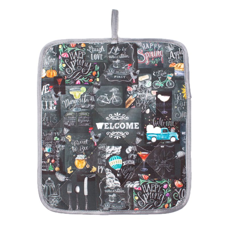 Текстиль на кухне играет важную роль. Какая хозяйка сможет обойтись без прихватки? С прихваткой “Добро пожаловать” процесс приготовления пищи станет легче и приятнее. С ней достать горячий противень или снять кастрюлю с плиты не составит труда. Стеганая прихватка изготовлена из прочного габардина. Имеет петельку для подвешивания. Цветовая гамма, выдержанная в черно-белых тонах, и небольшие яркие цветовые пятна выглядят необычно и сразу привлекают внимание. Создайте неповторимую атмосферу новогодних праздников в Вашем доме с предметами интерьера из нашего магазина!