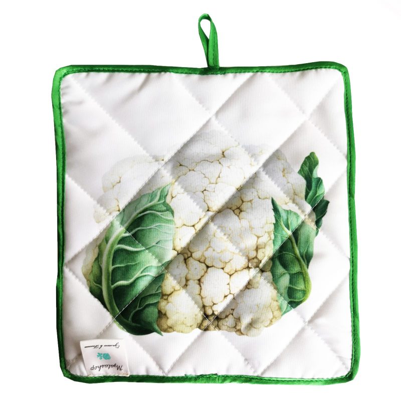Текстиль на кухне играет важную роль. Какая хозяйка сможет обойтись без прихватки? С прихваткой “Овощи” процесс приготовления пищи станет легче и приятнее. С ней достать горячий противень или снять кастрюлю с плиты не составит труда. Стеганая прихватка изготовлена из прочного габардина. Имеет петельку для подвешивания. С обеих сторон украшена рисунком с изображением цветной капусты. Такая прихватка может стать красивым и полезным подарком. Создайте неповторимую атмосферу в Вашем доме с предметами интерьера из нашего магазина!