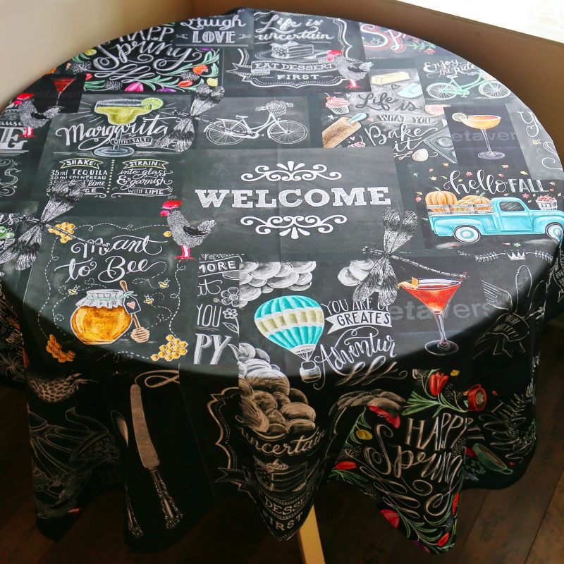 Стильная скатерть “Добро пожаловать” с эффектным рисунком преобразит Вашу квартиру или загородный дом и станет оригинальным предметом интерьера! Цветовая гамма, выдержанная в черно-белых тонах, и небольшие яркие цветовые пятна выглядят необычно и сразу привлекают внимание. Ткань, из которой изготовлена скатерть, качественная, практически не мнется, легко стирается, быстро сохнет и надолго сохраняет первоначальный внешний вид. Мы заботимся о красоте и уюте Вашего дома и предлагаем купить дизайнерскую скатерть в нашем уютном интернет-магазине! Можно заказать скатерть по индивидуальным размерам, а также дополнить интерьер другими предметами серии “Меловая доска”.Материал: Габардин (100% полиэстер) Уход: Стирка в стиральной машине Производитель: Myatashop, Россия.