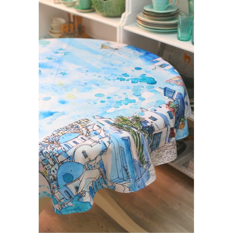 Круглая скатерть “Греция” станет стильным дополнением интерьера Вашего дома. Выполненная из практичного современного материала (сатен), украшенная городскими пейзажами греческого города в лазурных тонах, она будет радовать Вас, создавая прекрасное настроение и наполняя Ваш дом ощущением солнечного лета. Оригинальный дизайн и стильное цветовое решение позволяют расставить необходимые акценты. Создайте неповторимую атмосферу в Вашем доме с предметами интерьера из нашего магазина!