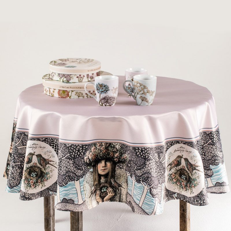 Нежная скатерть “Лесная фея” подарит праздничное настроение и наполнит Ваш дом теплом и уютом. Круглая скатерть украшена образом феи на фоне деревьев и изображениями медальонов с парой птиц у гнезда. Фея также держит в руках гнездо, по краям которого сидят две птички. Скатерть изготовлена из прочного и практичного современного материала. Может использоваться как самостоятельный элемент интерьера, так и в качестве дополнения коллекции “Лесная фея”, которая создана дизайнером “Myatashop” на основе рисунков российского художника Алёны Наливкиной. Оригинальный и стильный дизайн позволяет расставить необходимые акценты. Создайте неповторимую атмосферу в Вашем доме с предметами интерьера из нашего магазина!