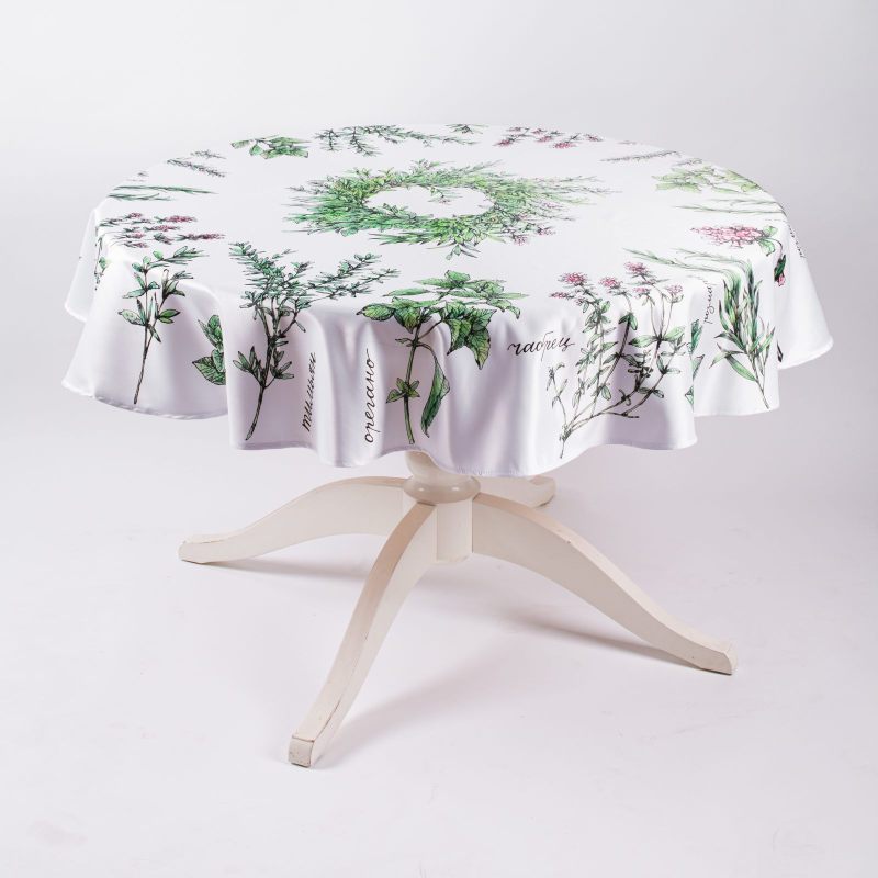 Круглая скатерть “Пряные травы” станет эффектным дополнением интерьера Вашего дома. Выполненная из современного прочного материала, украшенная изображением ароматных трав с подписями их названий, она будет радовать Вас, создавая прекрасное настроение и наполняя Ваш дом ощущением лета. Скатерть может использоваться как самостоятельный элемент интерьера, так и в качестве дополнения коллекции “Пряные травы”. Оригинальный дизайн и стильное цветовое решение позволяют расставить необходимые акценты. Создайте неповторимую атмосферу в Вашем доме с предметами интерьера из нашего магазина!
