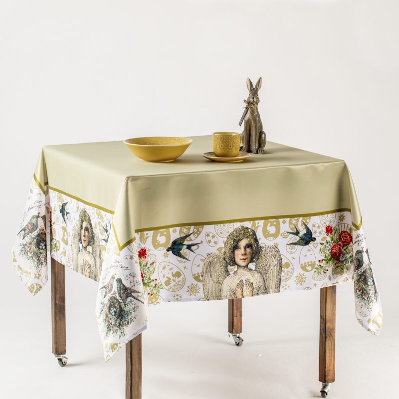 Наполнить дом теплом и уютом и создать праздничное настроение позволит скатерть “Пасхальная”. Квадратная скатерть золотистого цвета с изображенными на ней ангелами, парами птиц у гнезда, расположенными в медальонах по углам скатерти, композициями из цветов смотрится нарядно и празднично. Изображения на тему Пасхи подарят соответствующее настроение в канун Светлого праздника, создавая ощущение спокойствия, домашнего тепла и уюта. Скатерть изготовлена из современного прочного и практичного материала. Может использоваться как самостоятельный элемент интерьера, так и в качестве дополнения коллекции “Пасхальная”, которая создана дизайнером “Myatashop” на основе рисунков российского художника Алёны Наливкиной. Оригинальный и стильный дизайн позволяет расставить необходимые акценты. Создайте неповторимую атмосферу в Вашем доме с предметами интерьера из нашего магазина!