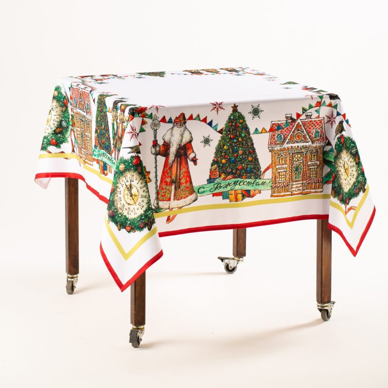 Яркая скатерть “Зимняя сказка” подарит новогоднее настроение и наполнит Ваш дом ощущением праздника. Белая квадратная скатерть украшена изображением Деда Мороза, наряженными елками, новогодними и рождественскими персонажами и надписью “С Рождеством”. Скатерть изготовлена из сатена (100% полиэстер); края оформлены подшивом. Погрешность измерения +-5 см. Может использоваться как самостоятельный элемент интерьера, так и в качестве дополнения коллекции “Зимняя сказка”. Оригинальный и стильный дизайн позволяет расставить необходимые акценты. Создайте неповторимую атмосферу новогодних праздников в Вашем доме с предметами интерьера из нашего магазина!