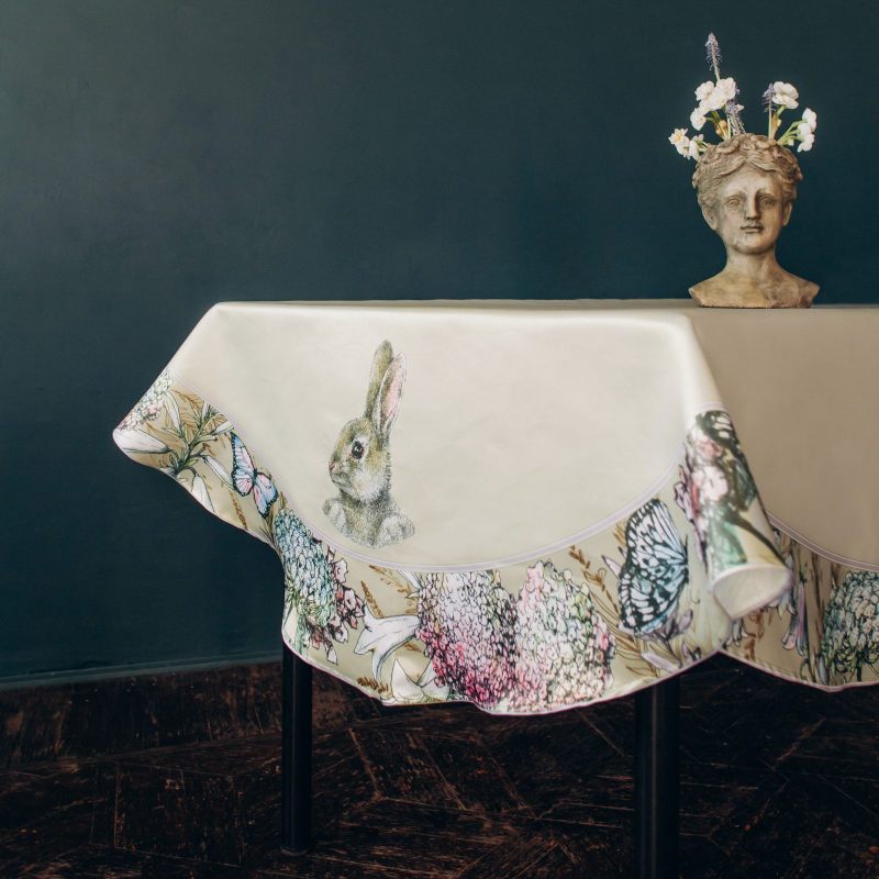 Очаровательная скатерть “Кролик в цветах” подарит праздничное настроение и наполнит Ваш дом теплом и уютом. Овальная скатерть приятного бежевого цвета украшена изображениями кролика в обрамлении бордюров с пасхальной тематикой. Скатерть изготовлена из прочного и практичного современного материала. Скатерть может использоваться как самостоятельный элемент интерьера, так и в качестве дополнения коллекции “Кролики” и разнообразного пасхального декора, представленного в нашем интернет-магазине. Оригинальный и стильный дизайн позволяет расставить необходимые акценты. Создайте неповторимую атмосферу в Вашем доме с предметами интерьера из нашего магазина!