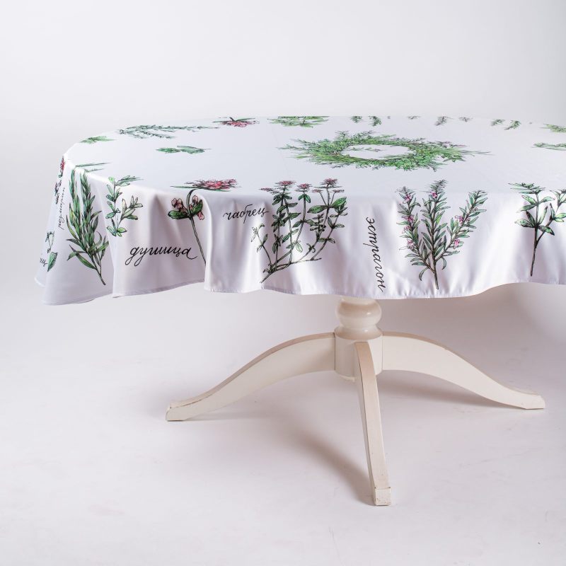 Овальная скатерть “Пряные травы” станет эффектным дополнением интерьера Вашего дома. Выполненная из современного прочного материала, украшенная изображением ароматных трав с подписями их названий, она будет радовать Вас, создавая прекрасное настроение и наполняя Ваш дом ощущением лета. Скатерть может использоваться как самостоятельный элемент интерьера, так и в качестве дополнения коллекции “Пряные травы”. Оригинальный дизайн и стильное цветовое решение позволяют расставить необходимые акценты. Создайте неповторимую атмосферу в Вашем доме с предметами интерьера из нашего магазина!