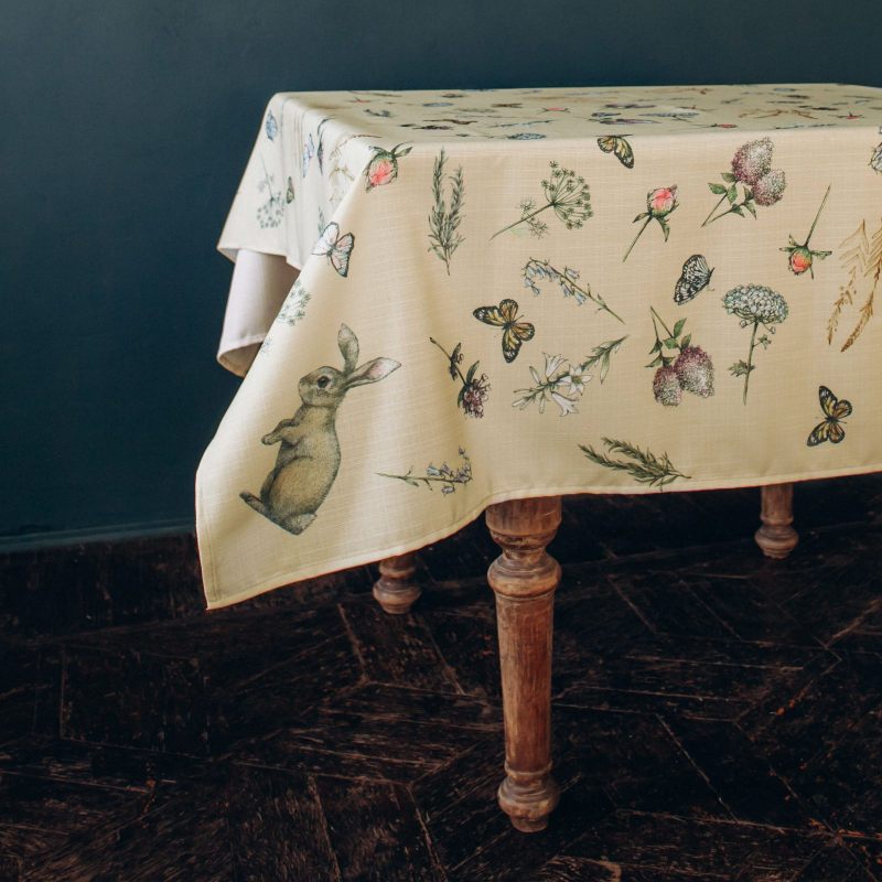 Милая скатерть “Кролик на лужайке” подарит праздничное настроение и наполнит Ваш дом теплом и уютом. Прямоугольная скатерть приятного бежевато-желтого цвета украшена изображениями кролика, вокруг которого изображены цветы и бабочки. Скатерть изготовлена из прочного и практичного современного материала. Скатерть может использоваться как самостоятельный элемент интерьера, так и в качестве дополнения коллекции “Кролики” и разнообразного пасхального декора, представленного в нашем интернет-магазине. Оригинальный и стильный дизайн позволяет расставить необходимые акценты. Создайте неповторимую атмосферу в Вашем доме с предметами интерьера из нашего магазина!