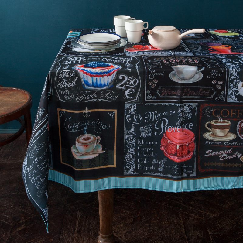 Красивая скатерть с эффектным рисунком преобразит Вашу квартиру и станет оригинальным предметом интерьера! Цветовая гамма, выдержанная в черно-белых тонах, и небольшие яркие цветовые пятна с изображением разнообразных десертов выглядят необычно и сразу привлекают внимание. Ткань, из которой изготовлена скатерть, качественная, практически не мнется, легко стирается, быстро сохнет и надолго сохраняет первоначальный внешний вид. Мы заботимся о красоте и уюте Вашего дома и предлагаем купить дизайнерскую скатерть в нашем уютном интернет-магазине! Можно заказать скатерть по индивидуальным размерам, а также дополнить интерьер другими предметами из ассортимента нашего магазина.