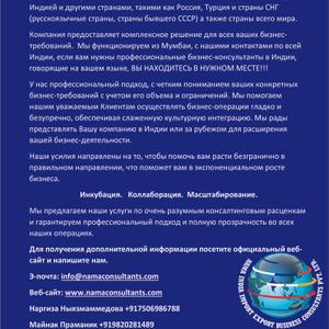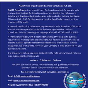 NAMA Consultants- Мы являемся специализированными бизнес-консультантами по экспорту импорту и вашим человеком в Индии. Наш консультационный отчет, помогает нашим уважаемым клиентам, понять индийский рынок практической и реалистической стороны, общий объём возможностей для бизнеса, общий доход, который можно заработать на этом рынке. Это помогло всем нашим клиентам принять полноценные правильные решения, помогая им сэкономить и заработать огромный доход